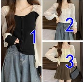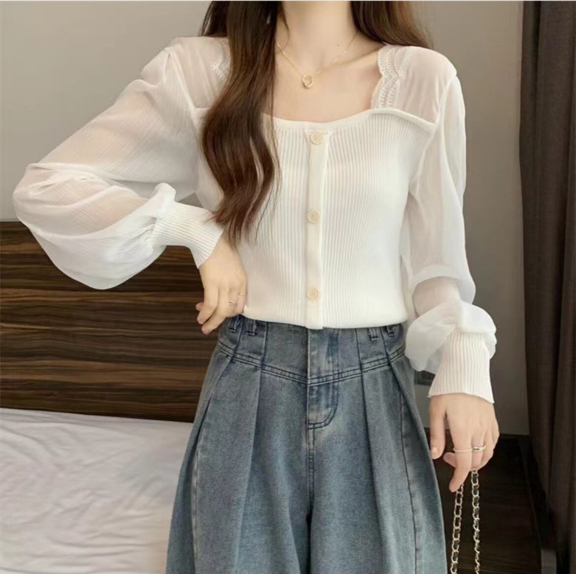 レデイース・方襟・シフォン長袖・ニット・気質・トップス・3色・秋の薄物